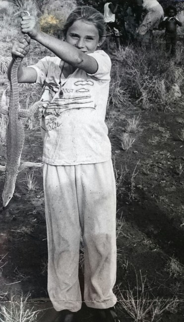 Alex Toyne holding a goanna on a bush tuckering trip near Yuendumu